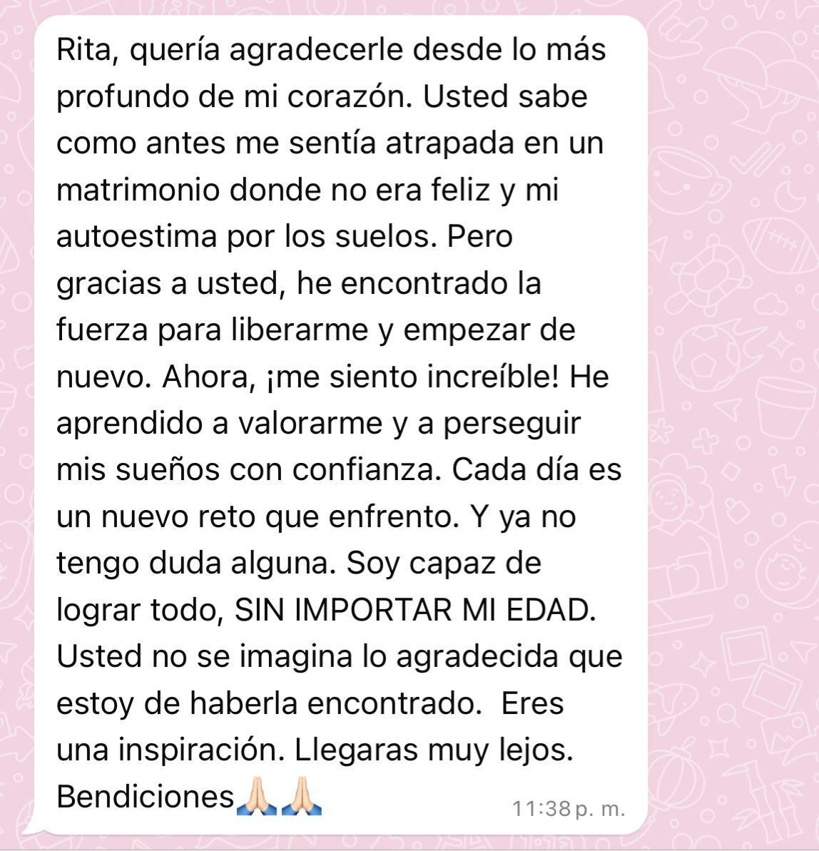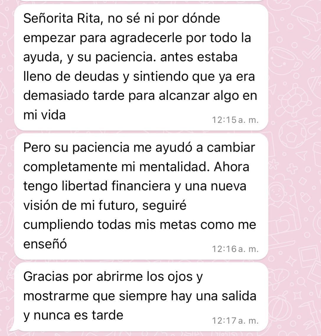 El Método Rita: es el conjunto de todas las técnicas que he estudiado varios años de entender como funciona la mente, la psicología cognitiva, la física cuántica, neuroplasticidad y como hacen las personas de éxito para lograr todo lo que se proponen y que yo mimsa he usado para manifestar TODO lo que deseo.